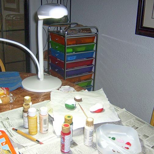 I found these wood veneer folded easels at Hobby Lobby and they nicely and attractively hold the the weight of painted rocks. They are available in 3, 5, 7, 9 and 12-inch sizes with a black or walnut finish. Regularly priced from $1.99 to $7.99, Hobby Lobby often has them available for 50% off. (Note: if your rock is too heavy, it may spread the stand's feet, making the stand unsuitable for that stone.)